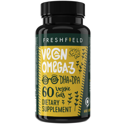 Freshfield Vegan Omega 3 DHA + DPA provides per-capsule 225 mg DHA and 35 mg DPA from microalgae (Schizochytrium spp.). The softgel is vegan, fish-free, and carrageenan-free. Packaging is plant-based and recyclable/compostable. The company promotes third-party testing and GMP manufacturing. Note: Freshfield also sells higher-potency omega-3 variants; verify the label to ensure you’re selecting the intended strength.