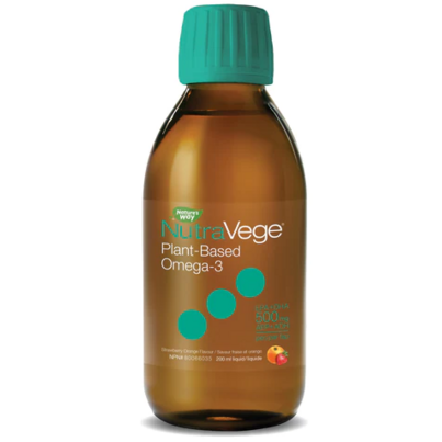 NutraVege Plant‑Based Omega‑3 Strawberry Orange is a vegan liquid omega‑3 supplement that combines plant‑derived eicosapentaenoic acid (EPA) and docosahexaenoic acid (DHA) in a fruit‑flavoured formula. Derived from Schizochytrium microalgae, each 5 mL (1 teaspoon) serving supplies 500 mg total EPA + DHA (300 mg EPA and 200 mg DHA) and uses organic medium chain triglyceride oil and natural strawberry and orange flavours to improve taste. This algae‑sourced formula is 100 percent vegetarian and vegan‑friendly and supports maintenance of good health, including cardiovascular, brain and eye function.
