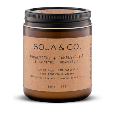 The SOJA & CO. Soy Wax Candle Eucalyptus & Grapefruit is a scented candle combining the refreshing aroma of eucalyptus with the energizing zest of grapefruit (along with additional scent notes such as orange, rhubarb, gardenia, soft woods, tonka bean, and sheer musk). It is made with 100 % natural soy wax and poured into a reusable amber glass jar with a cotton wick. The candle is crafted by hand in Québec, Canada.